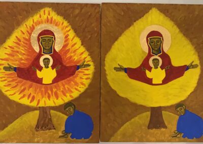 Mon style est assez polyvalent. Je produis principalement de l’art chrétien. J’adore la peinture d’icônes et j’ « écris » des icônes depuis plus de 25 ans. J’aime peindre des icônes personnalisées pour les gens. Mais j’aime aussi faire des croquis et dessiner. En cours de route, j’ai développé l’art des mandalas bibliques.